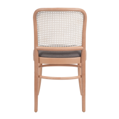 Die natürliche Rückenlehne aus Rattangeflecht verleiht der Form zusätzliche Subtilität und unterstreicht ihre klassischen Wurzeln. Dieses bewährte Detail wird seit Jahren erfolgreich in gastronomischen Innenräumen eingesetzt.