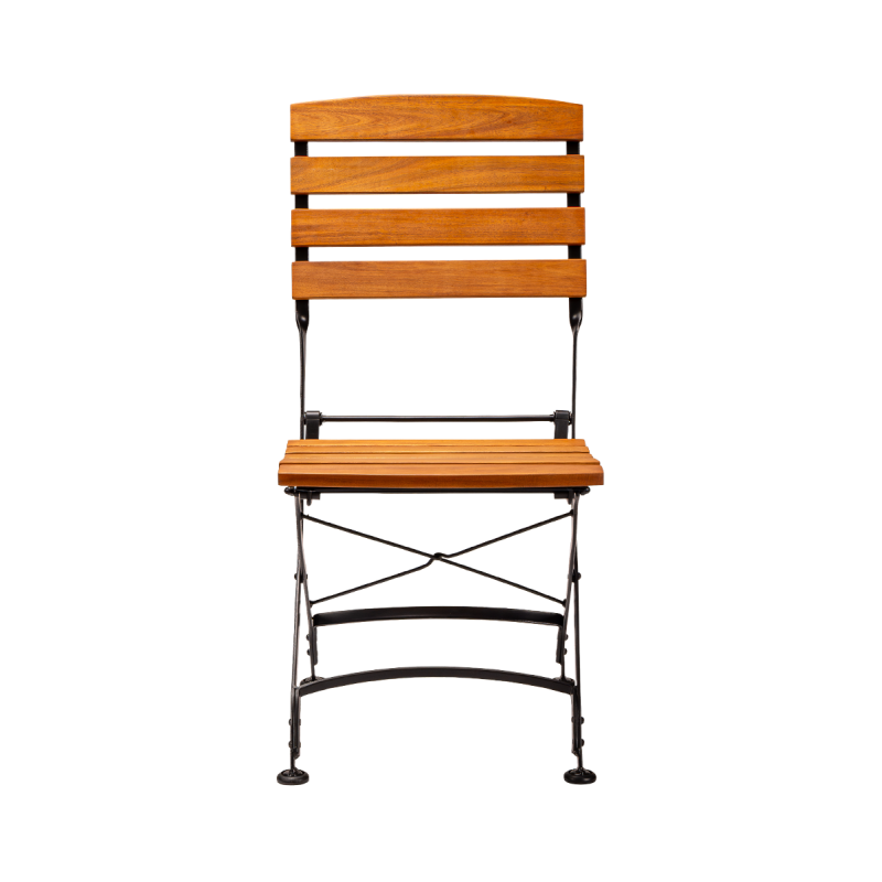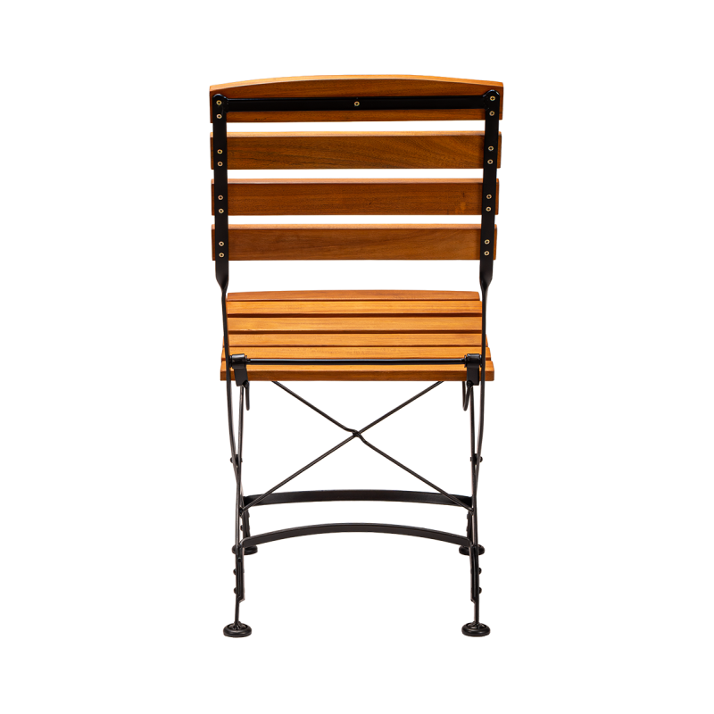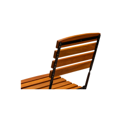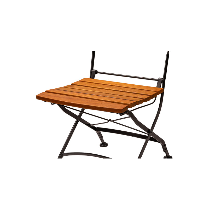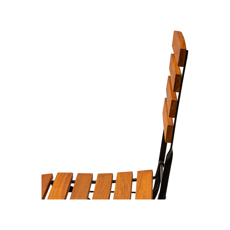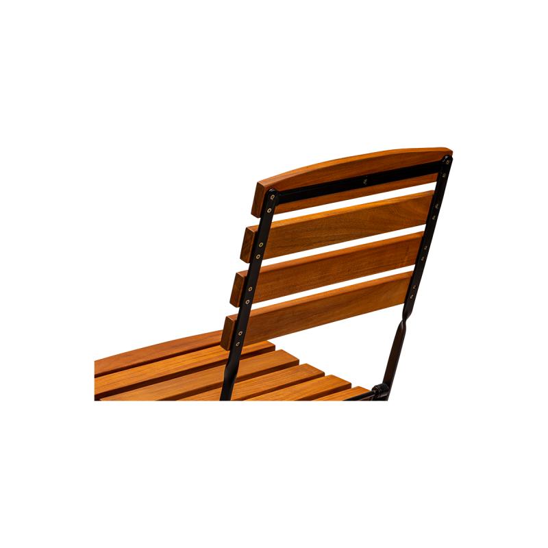 Das Gestell besteht aus pulverbeschichtetem Stahl in glänzendem Schwarz. Das 6 mm starke Profil sorgt für Stabilität und Widerstandsfähigkeit bei intensiver Nutzung. Sitzfläche und Rückenlehne bestehen aus Holzlatten (19 mm stark, 55 mm breit), die Komfort und ein natürliches, zeitloses Aussehen bieten. Der Stuhl ist klappbar, was Lagerung, Transport und die schnelle Vorbereitung des Gästebereichs erleichtert.