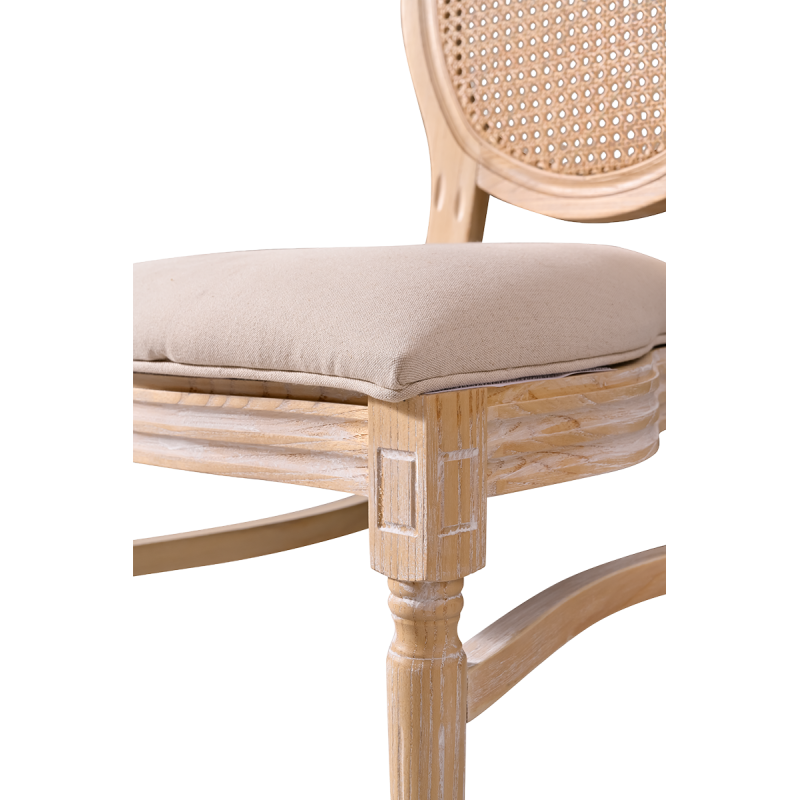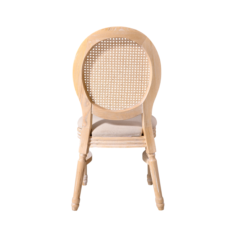 Gefertigt aus massivem Holz, bietet der Stuhl Stabilität und Langlebigkeit – ideal für den intensiven Einsatz in gewerblichen Objekten. Die Rückenlehne aus Rattan durchbricht subtil die klassische Form und verleiht ihr Leichtigkeit und Finesse. Die gepolsterte Sitzfläche sorgt für höchsten Komfort, selbst während langer Feierlichkeiten und Veranstaltungen.
