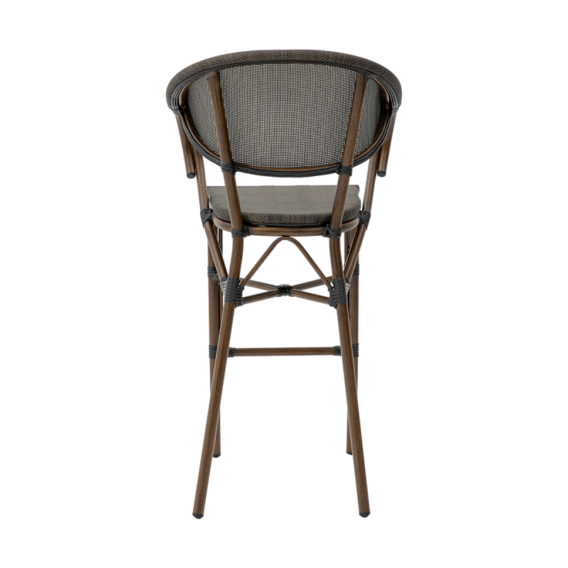 In dieser Variante des CAMILLO BAR wurden Sitz und Rückenlehne aus Technorattan- Geflecht gefertigt, das fest in die Konstruktion integriert ist und eine gleichmäßige, stabile Oberfläche bildet. Diese Ausführung bietet eine komfortable Unterstützung und angenehme Flexibilität, die besonders bei längerer Nutzung wichtig ist. Das feine, dichte Geflecht verleiht dem Stuhl einen eleganten Charakter und ist gleichzeitig für den intensiven Einsatz im Gastronomiebereich ausgelegt. Zusätzlich überzeugt das Material durch seine UV-Beständigkeit.